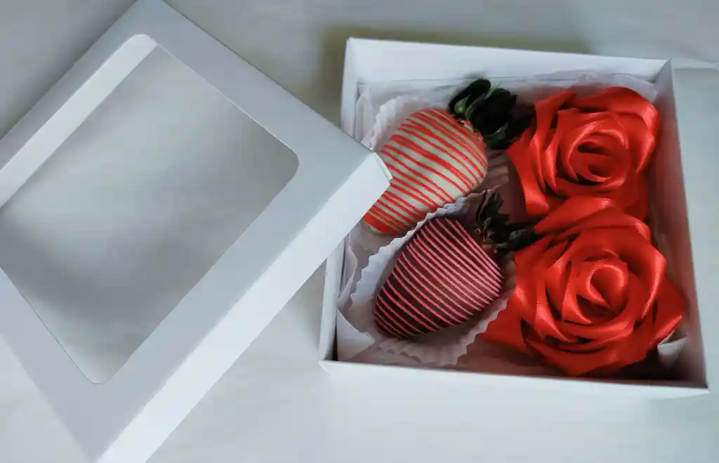 Caja blanca con ventana, fresas cubiertas de chocolate más rosas preservadas