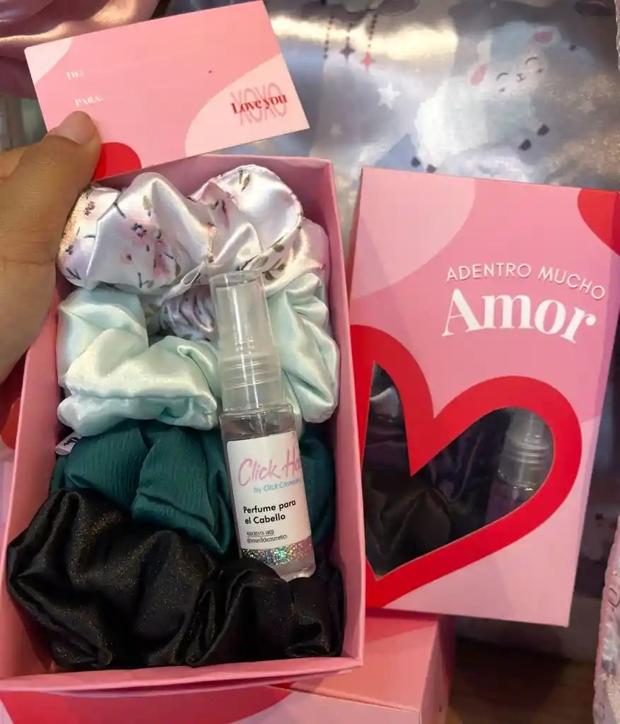 Cajita de regalo con diseño de amor Incluye 4 moñas medianas en satín y 1 perfume mini pequeño de cabello a base de argán y keratina. La caja tiene tarjeta para que la marques