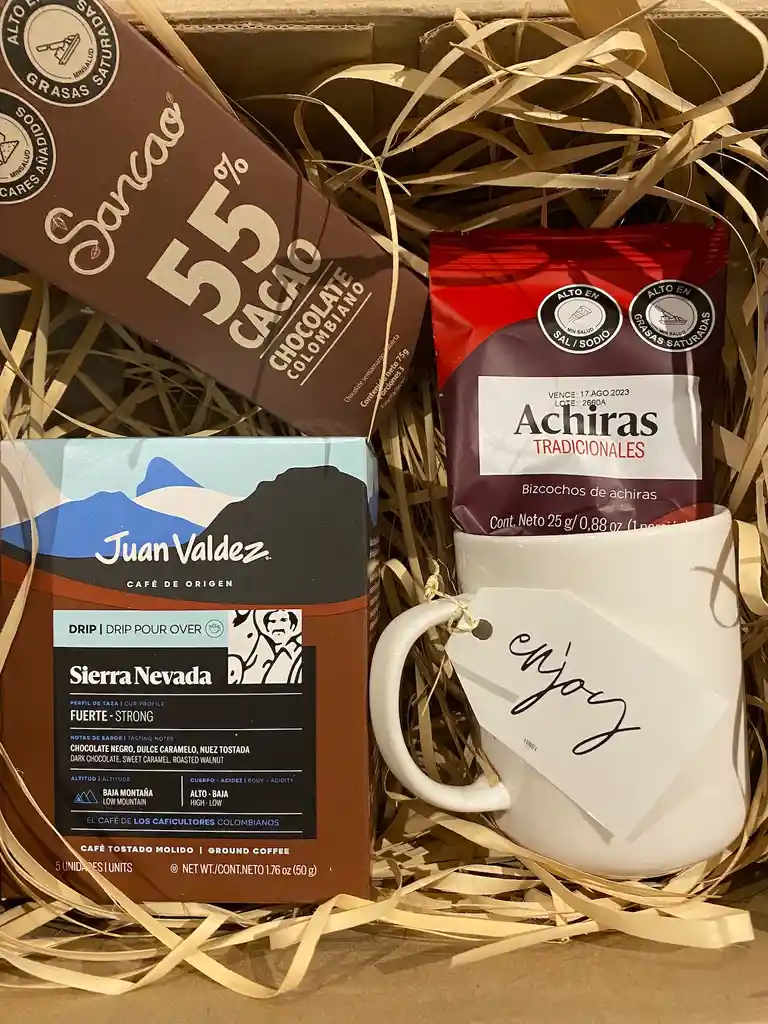 Caja de Regalo Amora Regalos contiene: 1 Caja de Café Drips Sierra Nevada de Juan Valdez, 1 Barra de Chocolate Sancao 55% Cacao, 1 Paquete de Achiras de Juan Valdez, 1 Mug Color Blanco de Casa Ideas. En caja de cartón con decoración incluída. ideal para regalar a clientes, empleados, amigos, mujeres u hombres, jóvenes y adultos. Importante: debido a nuestros procesos de calidad la caja de regalo se elabora en el momento de tu compra, este proceso tarda de 1-2 horas, para que contemples este tiempo.