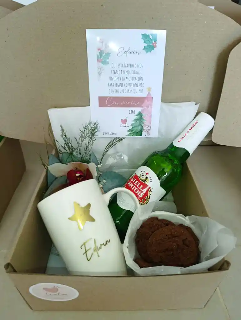 Caja de regalo de navidad verde Contiene Caja de carton corrugado Mug de navidad ( figura variada) cerveza stella Porcion de galletas de chocolate tarjeta personalizada