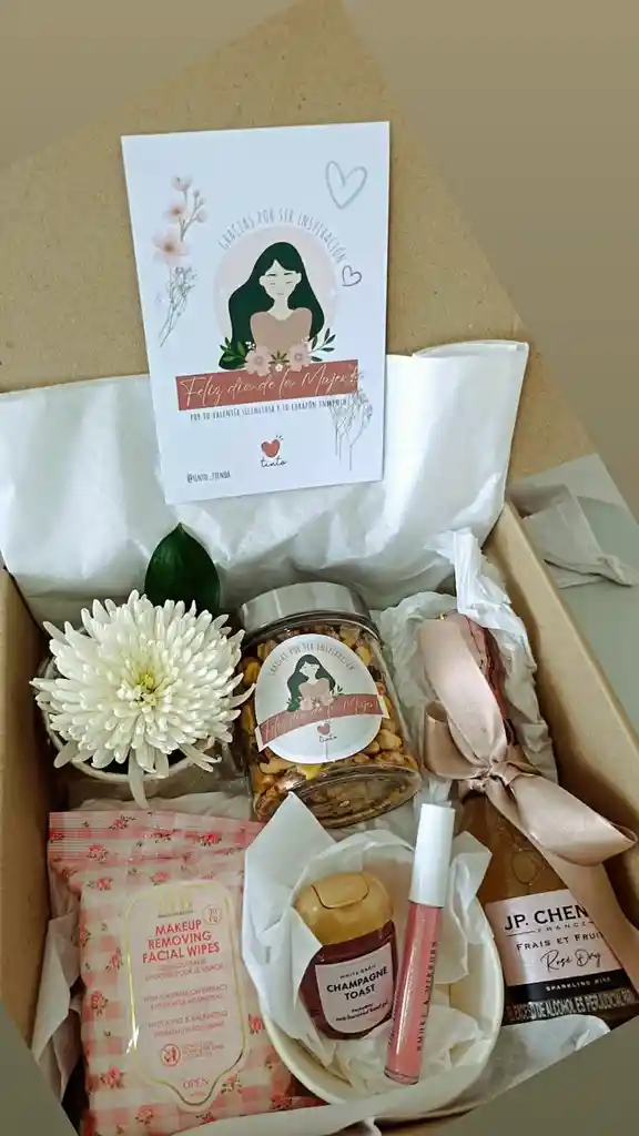 Caja de regalo día de la mujer Cariñito 8 de marzo Contiene Caja de cartón corrugado mini ramo de flores tarjeta día de la mujer personalizada vino personal JP chenet Paquete de toallas desmaquilladoras M-B Anti bacterial Champagne toast - Bath and body works Lip Gloss Smoke and mirrors frasco de vidrio con frutos secos