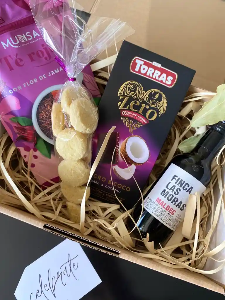 Caja de Regalo Amora Regalos contiene: 1 Piba de Vino Tinto Finca Las Moras 187 Ml., 1 Paquete de Té Rojo Munsa con flor de Jamaica 20 Tisanas, 1 Barra de Chocolate Negro y Coco sin Azúcares añadidos Torras, 1 Cono de Galletas Alemanas de Mantequilla. En caja de cartón con decoración incluída. Ideal para regalar a mujeres jóvenes o adultas, madres, abuelas, tias, esposas, clientes, colaboradoras, amigas. Importante: debido a nuestros procesos de calidad la caja de regalo se elabora en el momento de tu compra.