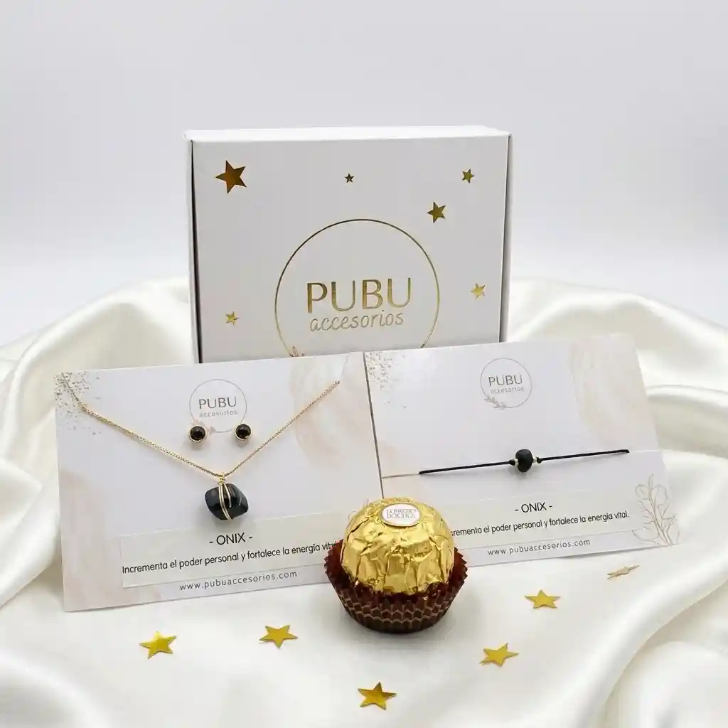 C1-3/M18-4 Set Ónix & Ferrero ✨ Regala protección y estilo con este sofisticado kit de Ónix natural. Un detalle lleno de fuerza y elegancia, diseñado para quienes buscan seguridad y un toque moderno en su día a día. ¿Qué incluye tu pedido? • Collar: Dije de ónix natural en cadena de acero inoxidable (resistente, hipoalergénica y de larga duración). • Topos: Aretes delicados de ónix negro (4mm de diámetro). • Pulsera: Hilo negro ajustable con piedra natural. • Chocolate: 1 Ferrero Rocher original. • Empaque: Caja de lujo con mensaje: "Incrementa el poder personal y fortalece la energía vital". Propiedades: El Ónix es la piedra de la fuerza, la autoconfianza y la protección contra las energías negativas. Materiales: Acabados de alta calidad en tono dorado sobre acero, ideales para uso diario.