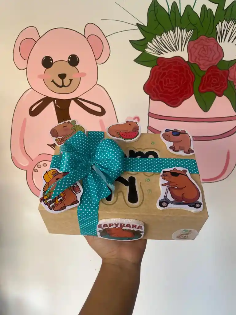 INCLUYE: dulces surtidos x9, papel decorativo, caja de cartón decorada con temática de Capibara, stikers, moño y frase "para ti" y mensaje personalizado que puedes dejar en el chat de la tienda