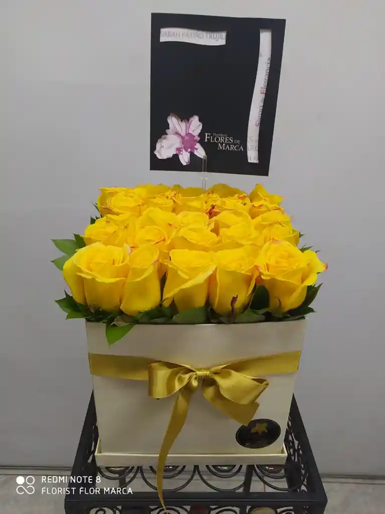 Se elabora en diferentes colores de rosas Roja Amarilla Rosada Blanca Fuscia Variada Contiene caja decorativa, follaje, complemento, moño, tarjeta
