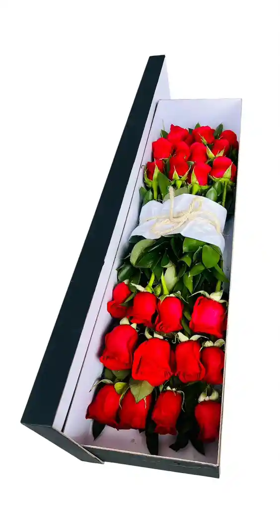 Arreglo floral x24 rosas tipo exportación en tonalidad rojo Follaje fino brillantina, rusco Moño en satín rojo Diseño elaborado en caja de cartón troquelado en forma rectangular negra