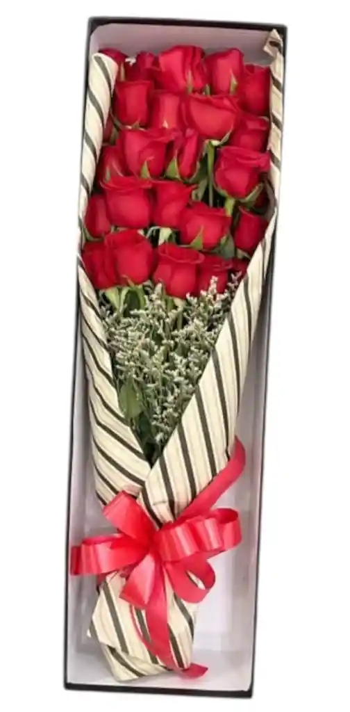CAJA CON 25 ROSAS FOLLAJE, MOÑO,PEPEL DECORATIVO , CAJA DE COLOR NEGRA , TERJETA PERSONALIZADA