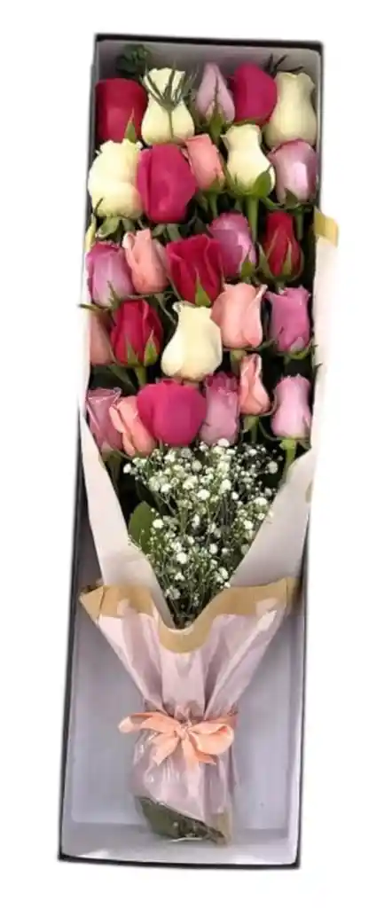CAJA CON 30 ROSAS SURTIDAS , FOLLAJE , PAPEL DECORATIVO , CAJA , TERJETA PERSONALIZADA