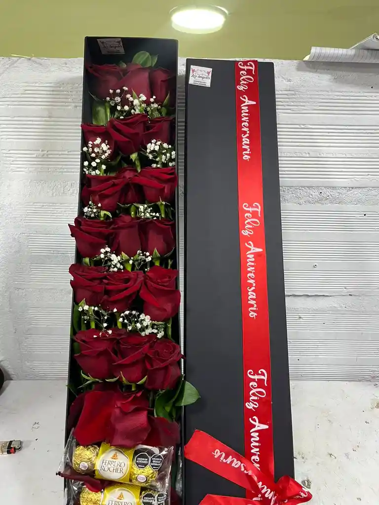 caja de carton fino con rosas rojas y chocolates incluye tarjeta con mensaje personalizado.