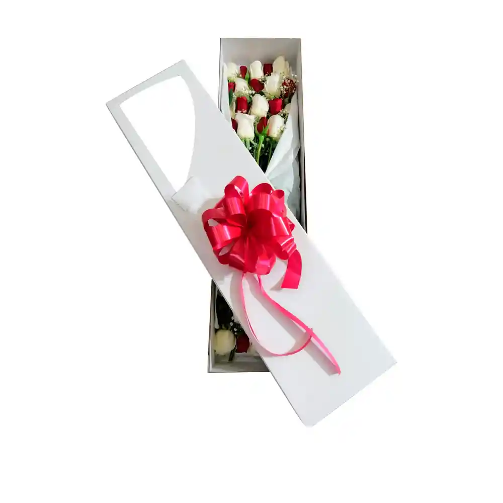 Caja de rosas rojas y blancas, ideal para un detalle novedoso y moderno con sus rosas acomodades ajedrezadas.