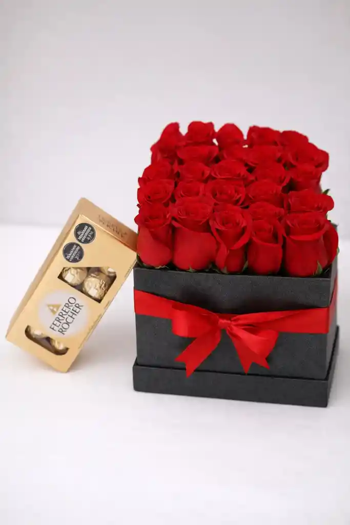 Contiene: 12 rosas rojas, caja Ferrero Rocher por 8 unidades en caja de cuadrada incluye d y mensaje personalizado Puedes dejar tus mensajes en el chat, nosotros los veremos. IMAGEN DE REFERENCIA