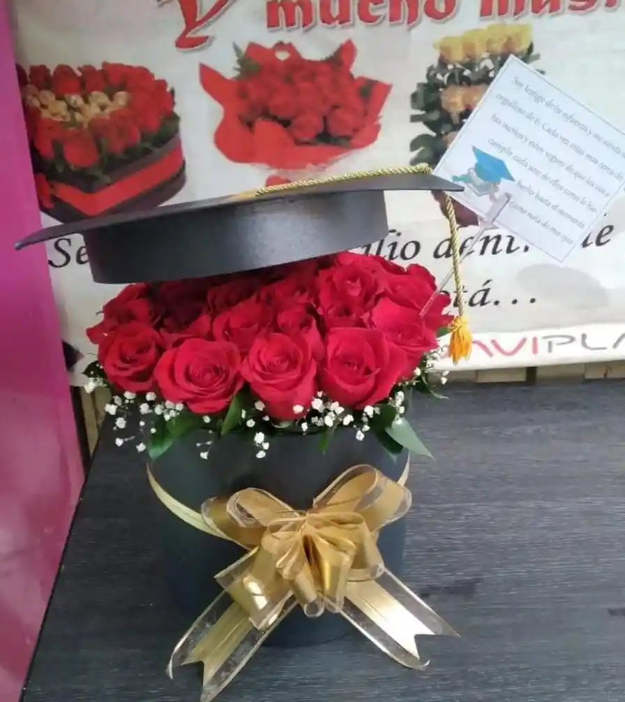 hermosa caja en forma de birrete, con 24 rosas, tarjeta y moño decorativo