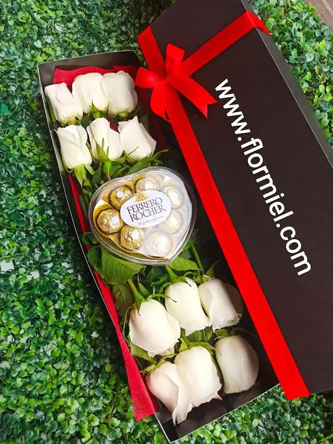 Caja de rosas estampada, negra o blanca según disponibilidad de la tienda, con 12 rosas blancas y caja de chocolates ferrero x 8 unidades.