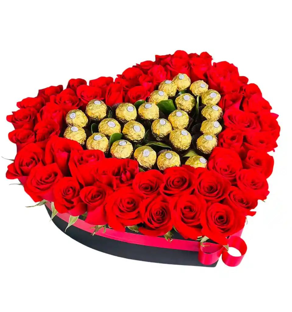 Arreglo floral x60 rosas tipo exportación en tonalidad rojo Chocolates ferrero rocher x25 unidades Follaje fino rusco Moño en satín rojo Diseño elaborado en caja de cartón troquelado 40x40 en forma de corazón negra