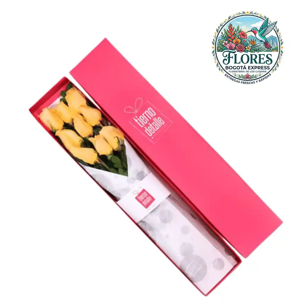 Elegante caja floral con 12 radiantes rosas amarillas, cuidadosamente presentadas en una sofisticada caja de regalo que resalta su belleza y frescura. Las rosas amarillas simbolizan amistad, alegría y buenos deseos, haciendo de este arreglo el detalle ideal para celebrar cumpleaños, agradecer, felicitar o iluminar el día de alguien especial con un gesto lleno de calidez y encanto.