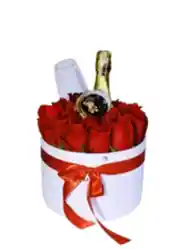 Caja redonda blanca con 16 rosas rojas y champagne JP Mini. La flor puede ser personalizada dependiendo de su disponibilidad.