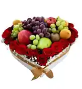 Caja de corazón con rosas y frutas Una innovadora combinación de 12 rosas frescas con frutas selectas en una caja en forma de corazón, ideal para sorprender con un detalle lleno de frescura y sabor. Nota: La flor puede ser sustituida dependiendo de la disponibilidad de color y del producto. "Mensaje Personalizado" máximo de 30 caracteres (Dejar el mensaje en el chat, los comentarios no se previsualizan para la tienda, por lo que si se dejan allí no podrá ser incluido).