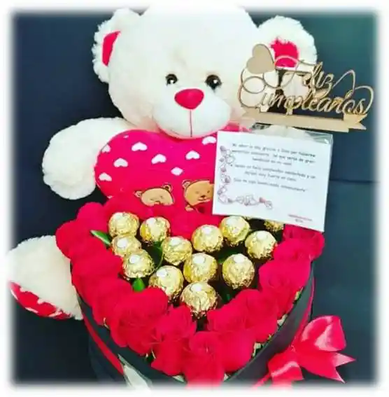 caja cuadrada o en forma de corazón, con peluche a elección y ferreros.