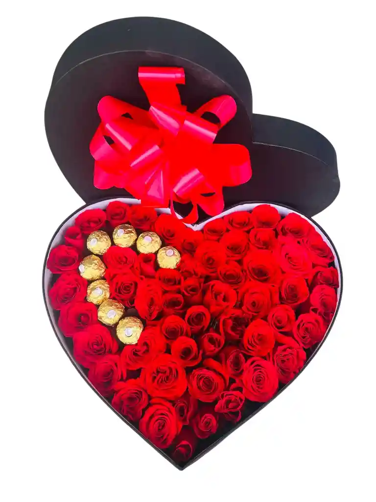 Arreglo floral x50 rosas tipo exportación en tonalidad rojo Chocolates ferrero rocher x8 unidades Moño en satín rojo Diseño elaborado en caja de cartón troquelado en forma de corazón negro