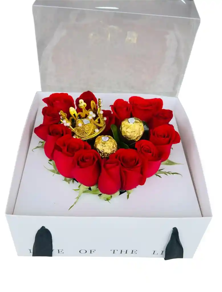 Arreglo floral x14 rosas tipo exportación en tonalidad rojo Chocolates ferrero rocher x3 unidades Corona de reina dorada Follaje fino brillantina Diseño elaborado en caja de cartón 20x20, tapa de acetato con tiritas
