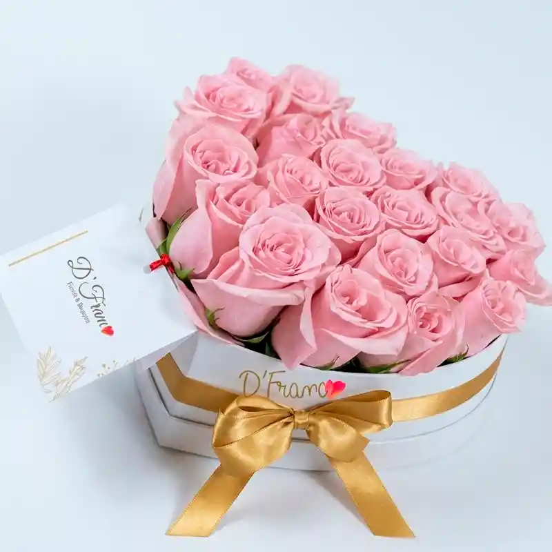 Floristería D'Franco, hemos creado este diseño pensando en quienes buscan un detalle sofisticado, moderno y lleno de significado. Las rosas rosadas simbolizan gratitud, cariño y admiración, siendo el regalo ideal tanto para parejas como para celebrar a mamá en el Día de la Mujer. Características de este Arreglo: Diseño Exclusivo: Caja de lujo en forma de corazón con acabado mate y detalles en cinta dorada. Rosas de Calidad: Entre 18 y 22 rosas rosadas (según apertura del botón) seleccionadas por su frescura y color vibrante. Presentación Impecable: Incluye tarjeta de dedicatoria de la casa D'Franco para tu mensaje especial.