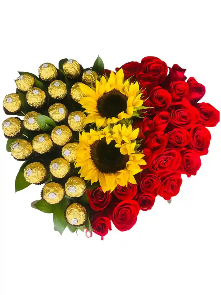 Arreglo floral x24 rosas en tonalidad rojo + 2 girasoles tipo exportación Chocolates ferrero rocher x21 unidades Follaje fino rusco Diseño elaborado sobre caja de cartón troquelado negra Moño en satín rojo