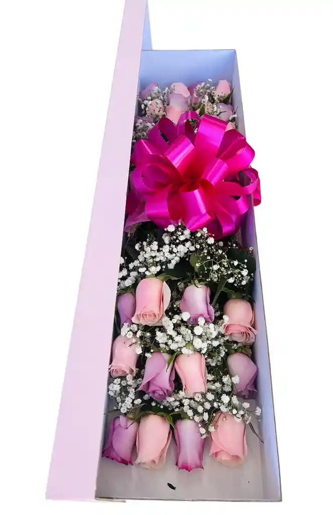 Arreglo floral x24 rosas tipo exportación en tonalidad rosado y lila Follaje fino gipsófilia, rusco Moño en satín fucsia Diseño elaborado en caja de cartón troquelado en forma rectangular rosada