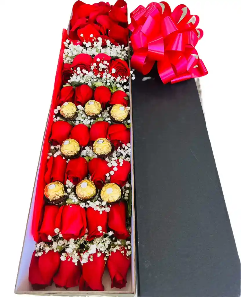 Arreglo floral x24 rosas tipo exportación en tonalidad rojo Chocolates ferrero rocher x8 unidades Follaje fino gipsófilia, rusco Moño en satín rojo Diseño elaborado en caja de cartón troquelado en forma rectangular negra