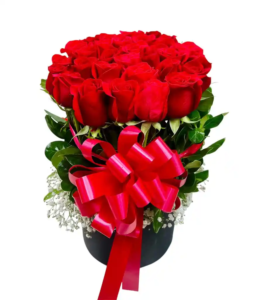 Arreglo floral x24 rosas tipo exportación en tonalidad rojo Follaje fino brillantina, gipsófilia Moño en satín rojo Diseño elaborado en caja de cartón troquelado 20x20 en forma redonda negra
