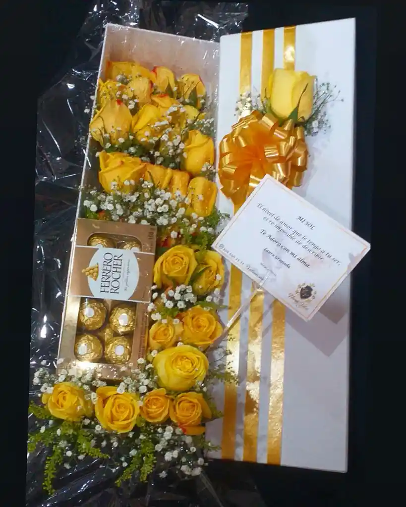 Caja de Rosas Rojas, con Ferrero x8, incluye tarjeta personalizada. Disponible Rosas en color Amarillo o Rojo