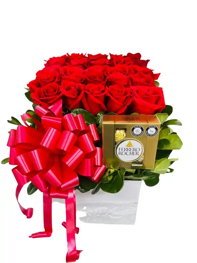 Arreglo floral x25 rosas tipo exportación en tonalidad rojo Chocolates ferrero rocher caja x4 unidades Follaje fino brillantina Moño en satín rojo Diseño elaborado en caja de cartón 20x20 troquelado en forma cuadrada blanca