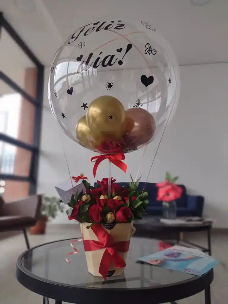 HERMOSA CAJA DE ROSAS X12UND CON CHOCOLATE FERREO X4UN + GLOBO BURBUJA PERSONALIZADO 1 UND