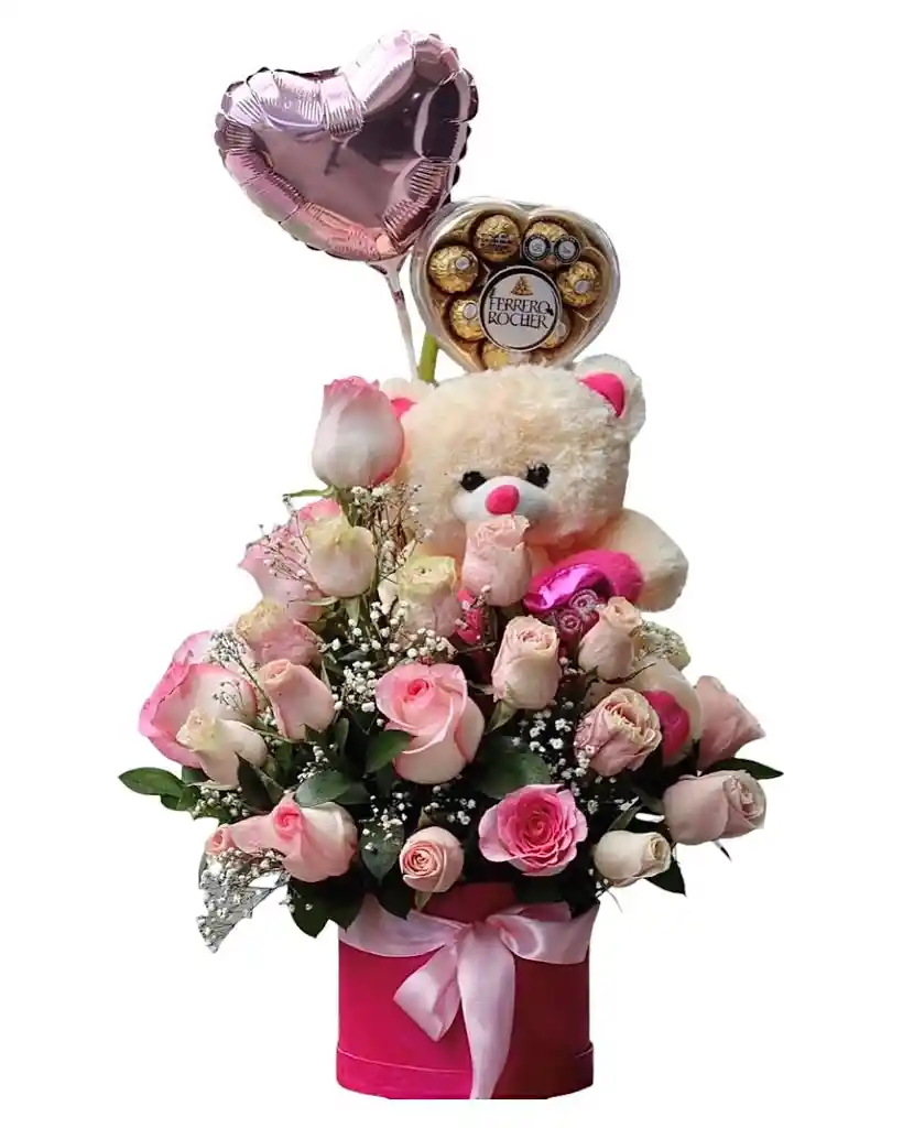 Caja floral roja con 15 unidades de rosas en tonos rosados, peluche pequeño, chocolates corazon de Ferrero Rocher y globo pequeño