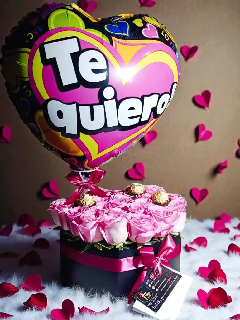 24 rosas aproximadamente, 3 chocolates Ferrero y (1) globo de acuerdo a la ocasión. Moño y tarjeta. Nota: Adjuntar información para realizar la tarjeta (Ocasión, de, para y mensaje)