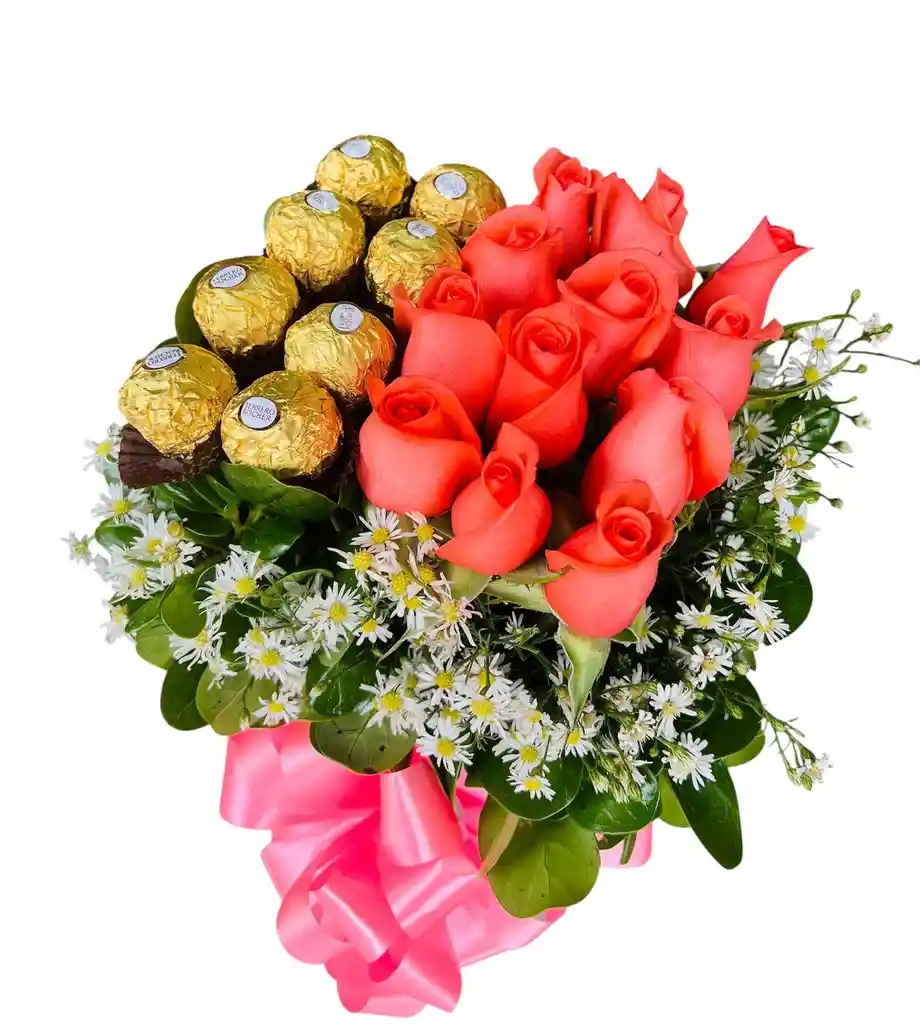 Arreglo floral x12 rosas tipo exportación en tonalidad salmón Ferrero rocher x8 unidades Diseño elaborado en caja de cartón troquelado en forma cuadrada Follaje fino brillantina, monte casino Moño en satín salmón