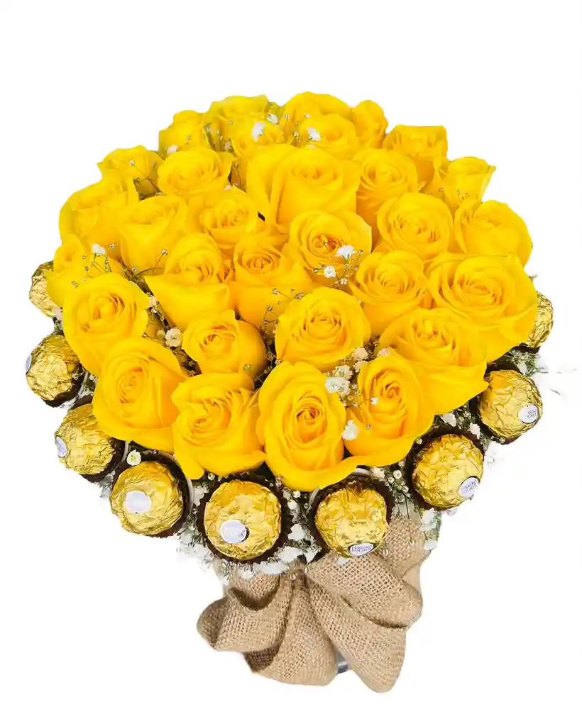 Arreglo floral x24 rosas tipo exportación en tonalidad amarillo Chocolates ferrero Rocher x12 unidades Follaje fino gipsófilia Moño en cinta fique café Diseño elaborado en caja de cartón troquelado 25x25 en forma redonda blanca