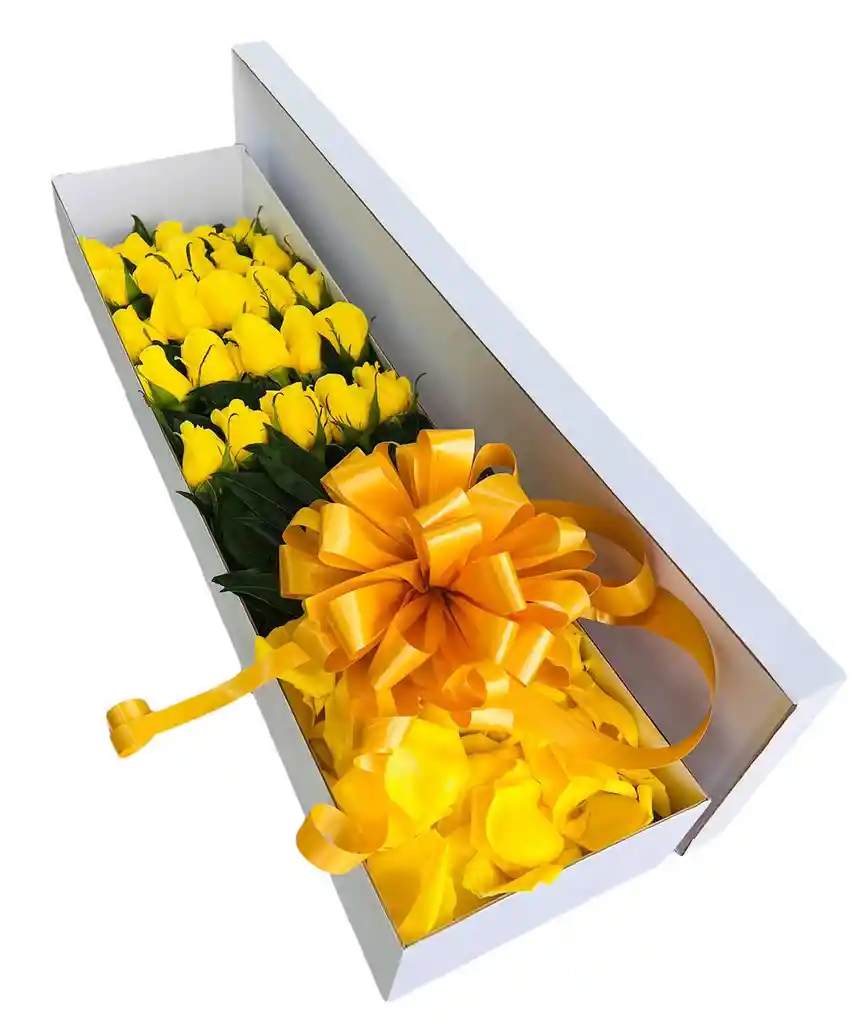 Arreglo floral x25 rosas tipo exportación en tonalidad amarillo Follaje fino rusco Moño en satín amarillo Diseño elaborado en caja de cartón troquelado en forma rectangular blanca