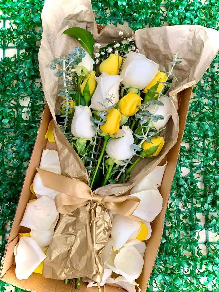 Caja de Cartón con 12 Rosas, variedad y follaje Moño de Satín y Mensaje impreso El color de las rosas puede variar de acuerdo a disponibilidad
