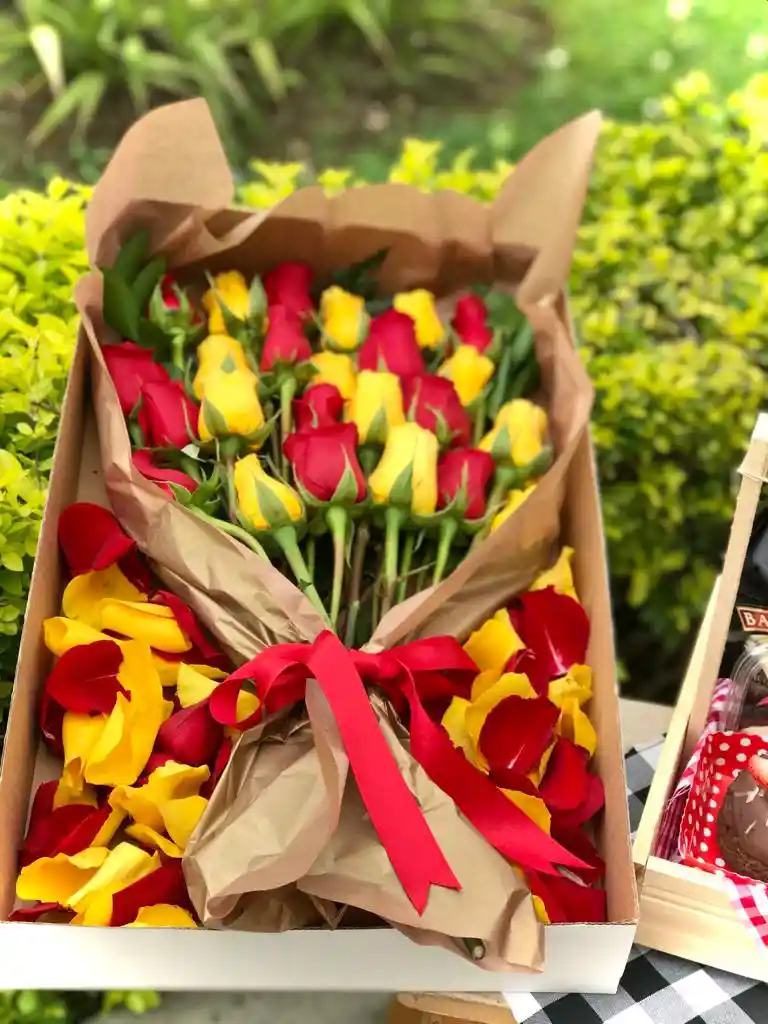 Caja de Rosas x 24 unidades mas variedad y follaje Moño de satin y mensaje impreso Los colores de la rosas pueden variar de acuerdo a disponibilidad