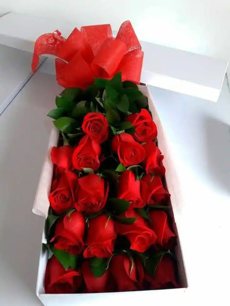 caja alargada con 24 rosas decoradas, moño y tarjeta