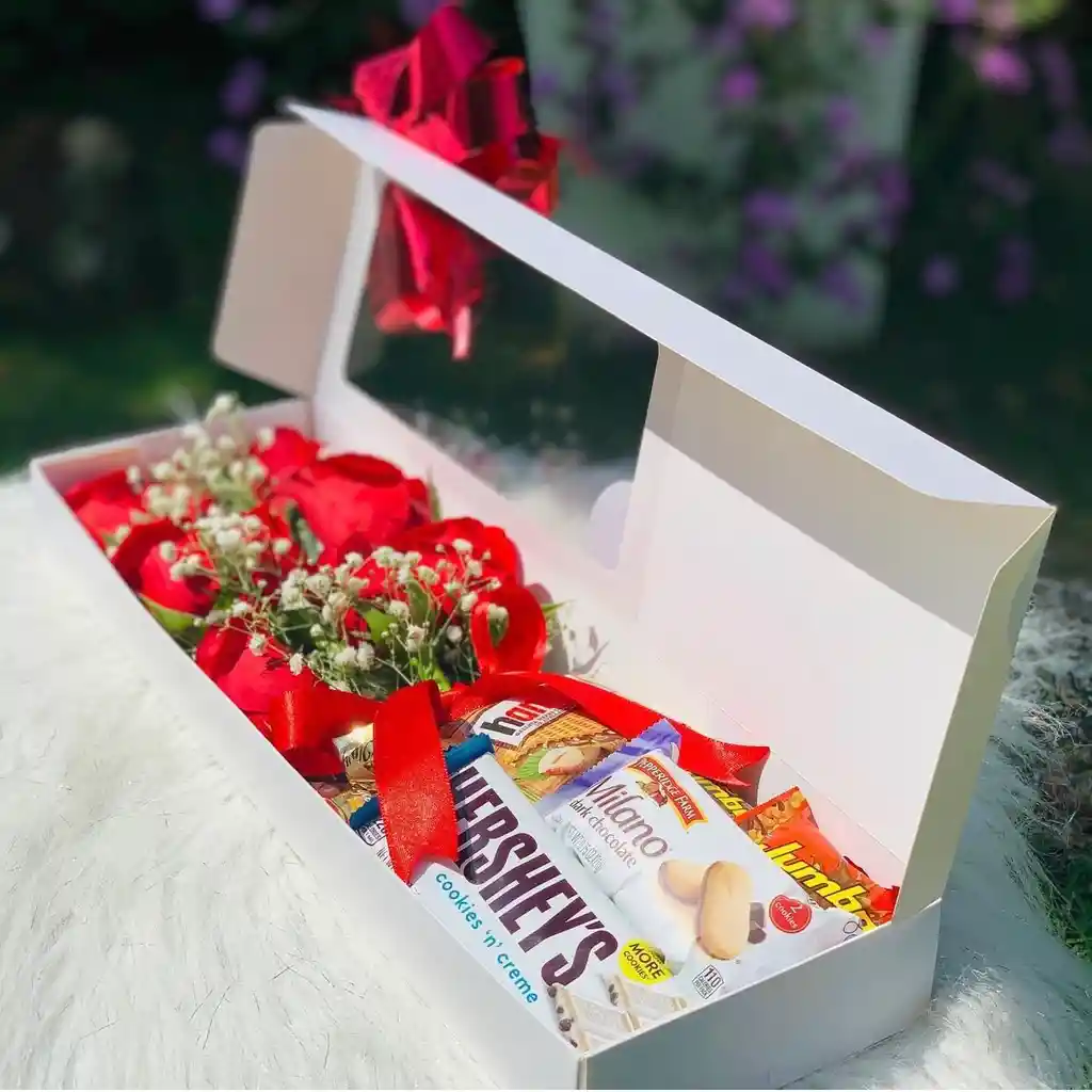 Contlene: •Bouquet de rosas tipo exportación. .•Chocolatina Hershey grande. .•Chocolatina Hershey mini. •Galleta hanuta.. •Almendras francesas. •3 Chocolates rellenos…. •Caja decorada, tarjeta personalizada. •2 globos con helio.