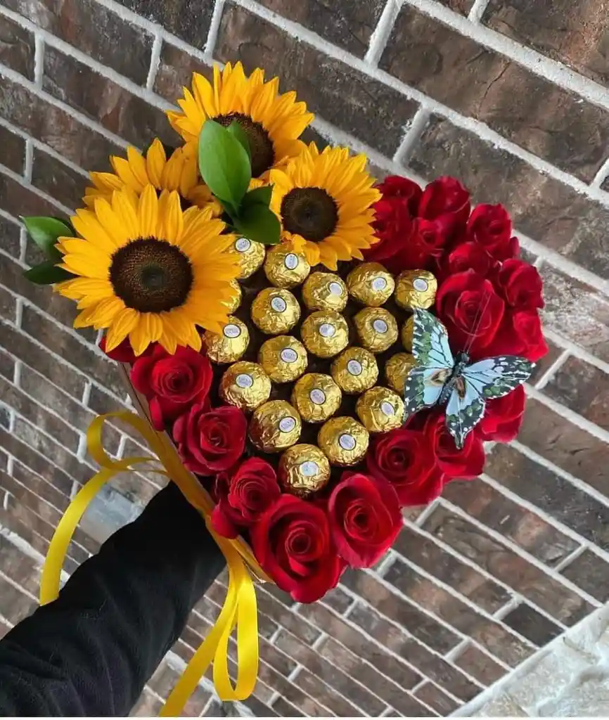 Una hermosa caja en forma de corazón, perfecta para expresar amor y cariño. El arreglo combina la pasión de las rosas rojas con la alegría de los girasoles. El centro está elegantemente decorado con chocolates Ferrero Rocher y un detalle de mariposa decorativa.