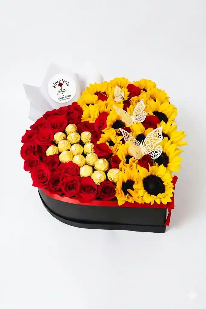 las rosas rojas y la dulzura de los chocolates tipo Ferrero Rocher. Un arreglo diseñado para sorprender y transmitir amor, felicidad y elegancia en un solo regalo. ✨ Detalles del arreglo: Caja rígida en forma de corazón. Alrededor: girasoles frescos que simbolizan alegría y energía. Centro: rosas rojas frescas que representan amor y pasión. Decoración con chocolates . Listón decorativo elegante al frente.