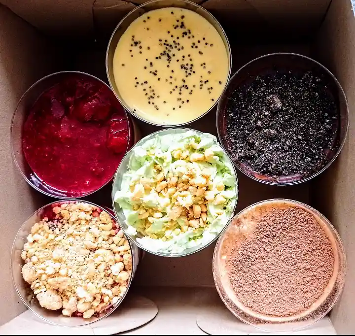caja con 6 shots de postres diferentes : tiramisu, mousse choco pistacho, chessecake de oreo, chessecake de frutos rojos, espomjado de maracuya, crumble de frutos rojos
