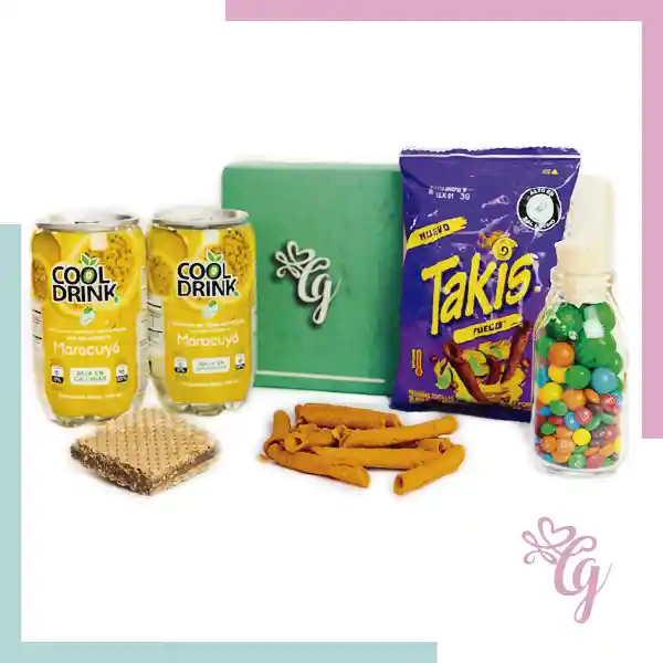Este regaloincluye: -2 Sodas Cool Drink (Agua saborizada con gas refrescante sabor a maracuyá) -1 Paq Takis 45gr (Pequeñas tortillas de maíz enrolladas y fritas sabor a taco, queso picante o chile y limón) -1 Hanuta (Galleta wafer crocante rellena de avellanas y cacao) -1 Frasquito Mielero 200ml (M&M, Agogó Tutti Frutti y Sandías) -1 Caja 100% Biodegradable hecha en fibra de cañaProhíbase el expendio de bebidas embriagantes a menores de edad. Ley 124 1994. El exceso de alcohol es perjudicial para la salud. Ley 30 de 1986.