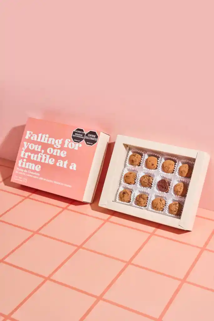 Todas las cajas son del mismo sabor, independientemente del empaque que escojas, solo cambia el mensaje y color de la caja. Contiene 12 trufas de chocolate aromatizadas con Cumarú del Amazonas. Sin azúcar, naturalmente libres de gluten y además son veganas. Con la textura suave y el sabor profundo que esperas de un buen chocolate.