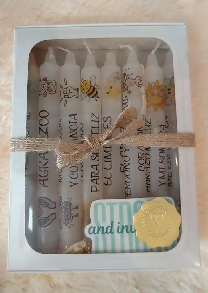Caja de cartón que incluye: 8 Velitas con frases de motivación personal. Sin aroma.