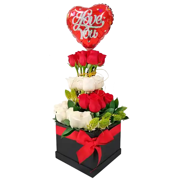 Arreglo elaborado en caja cuadrada con rosas blancas, rosas rojas, estrellas de belén, rusgo, globo pequeño y lazo de razo. Caja y globo según disponibilidad.