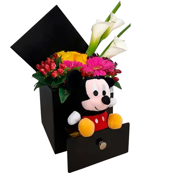 Hermosa Caja Cuadrada Elaborada en 3 Cartuchos, 4 Rosas Amarillas, 2 Gerberas y Follaje en Café Guajiro Rojo. Peluche Pequeño. Color de Caja y Peluche Sujetos a Cambio.