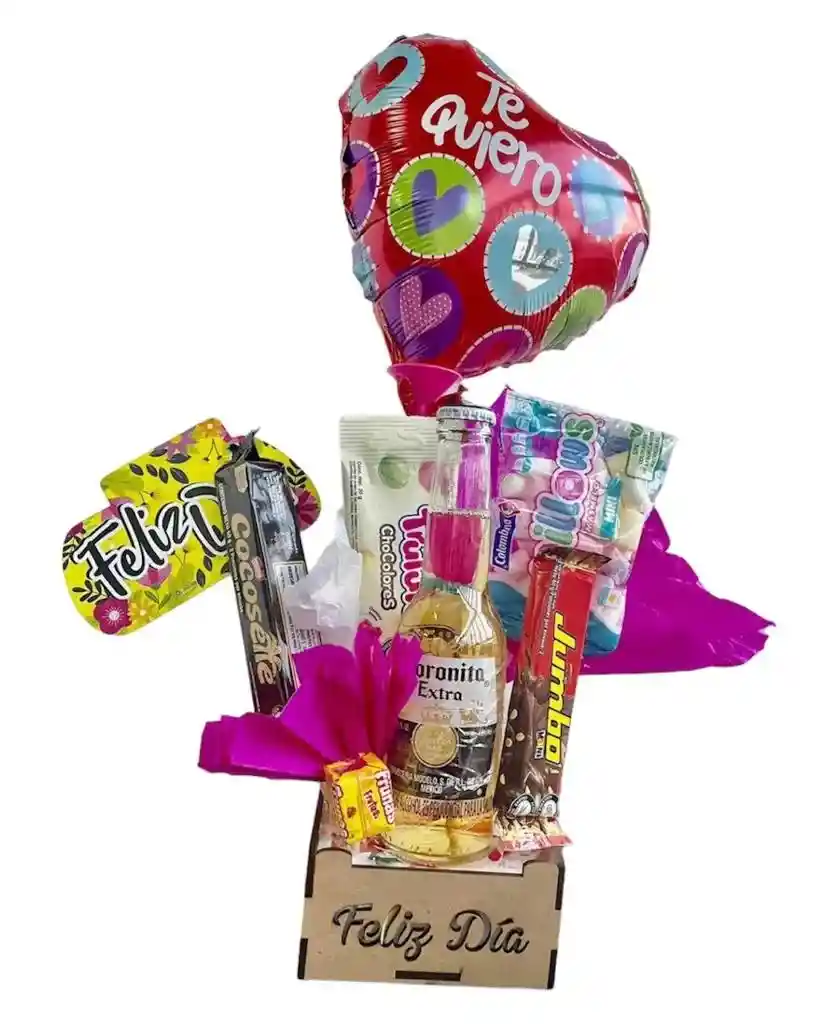 pequeña caja que contiene cerveza coronita, variedad de dulces, pin de feliz dia y globo